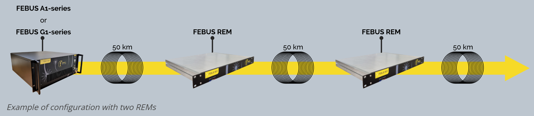 FEBUS REM (Range Extension Module) to moduł zaprojektowany do rozszerzania zasięgu systemów sensoryki optycznej przez regenerację sygnału optycznego bezpośrednio na linii.
